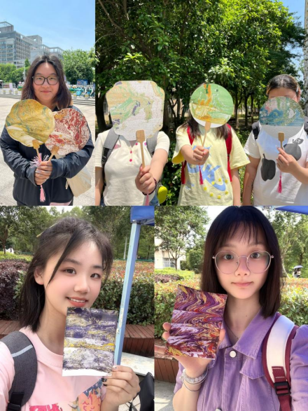 艺术设计学院、数字艺术产业学院心理健康教育部的干事们热情地为参与的同学介绍漆扇制作工艺以及背后的文化故事,帮助前来参与的同学们挑选合适的漆色,当漂漆在水面形成发散形状时,教导他们以点、甩、弹、划等手法,将团扇或空白卡纸沉浸其中,让飘漆绘出图案效果,完成漆扇或者漆画的制作。参与同学沉浸于色彩带来的欢乐之中,充分运用艺术创作的表达性和创造性,缓解情绪压力,提升自我认知,疗愈心灵。