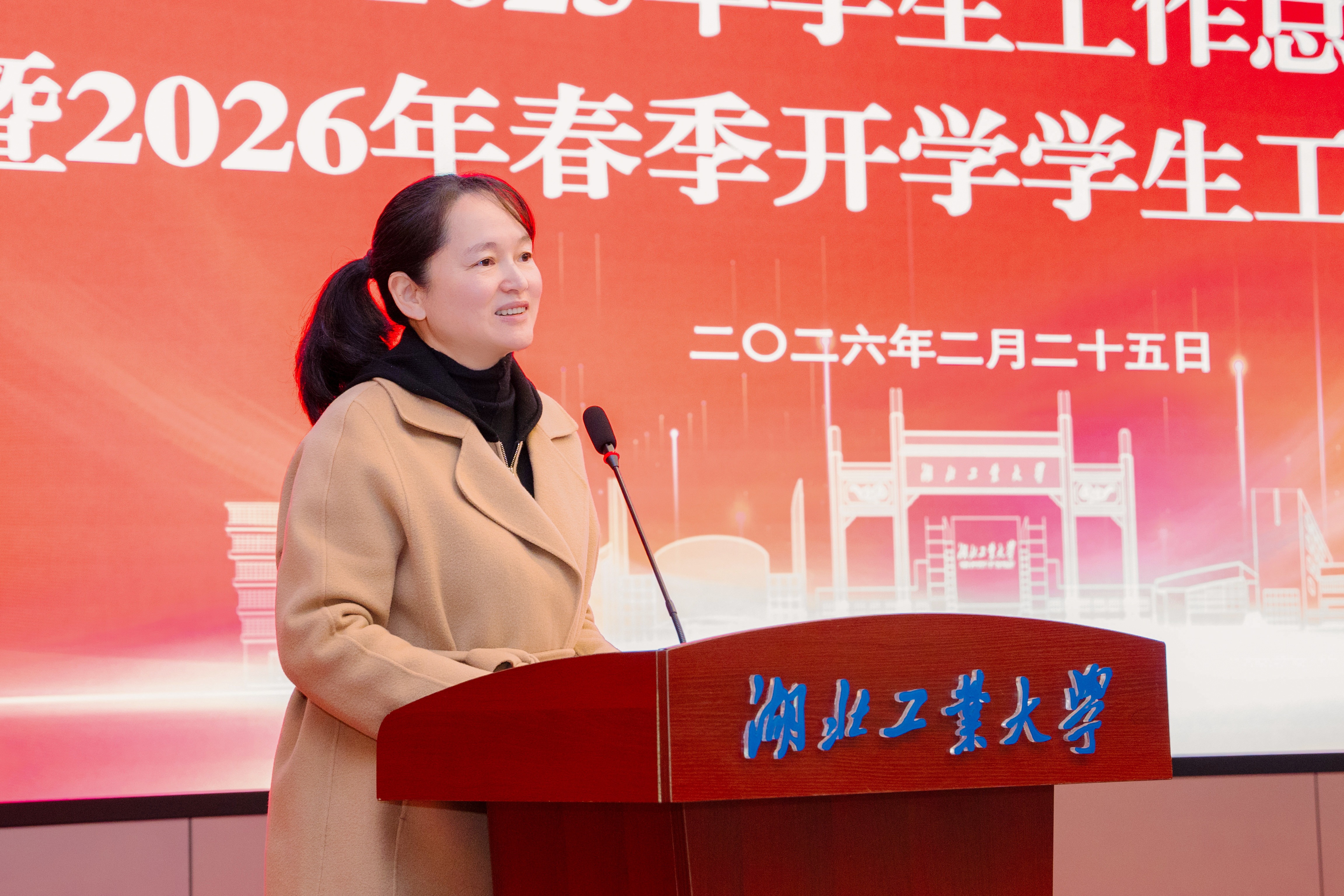 任卫华以“强调”“感悟”“展望”三个关键词与大家作分享交流,强调开学工作千头万绪,安全稳定重于泰山,请各单位将学生安全抓在经常、融入日常,织密校园安全防护网,确保新学期平稳有序。感悟13个学院的工作汇报充分体现了湖工大学生工作的扎实根基、鲜明特色与前瞻思考,同绘就思政育人工作的生动画卷。展望2026年,要全面实施“1239”工程:紧扣立德树人根本任务,强化“一站式”学生社区2.0建设和高素质辅导员队伍建设,筑牢“三条轴线”,全力守牢“底线”、做强“主线”、跃升“高线”,聚力实施“九项行动”,为学校高质量发展贡献学工力量。