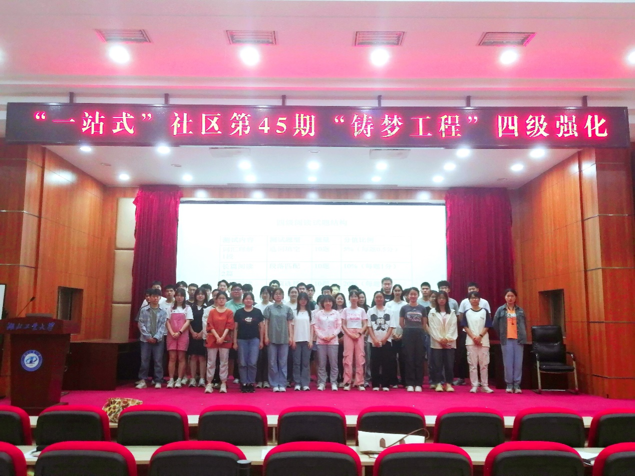 5月6日到27日,“一站式”社区第45期“铸梦工程”四级强化活动在大学生活动中心博学堂开展。本次活动特别邀请外国语学院杜亚芳老师主讲,以“强化四级基础,增强过级信心”为主题,分四期展开,来自全校不同学院的100余名学生积极参与活动。