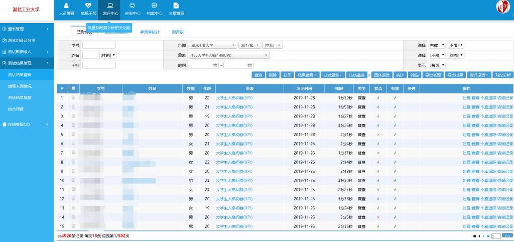 此次测评采用北京心海导航教育科技股份有限公司研发的系统平台,使用手机端进行测评,施测SCL-90和UPI两个量表,主要评估学生在心理健康状况、人格特质等方面的现状。与大一新生进校时采用同样的量表进行前后测,能有效反映在校学生的心理变化情况。