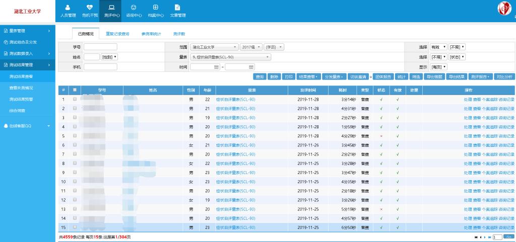 心理发展是一个动态变化的过程,为深入了解我校在校学生的心理健康状况,有针对性的开展心理健康教育工作,协助学生更好的适应大学生活,帮助学生健康成长,湖北工业大学心理健康教育与咨询中心于2019年11月开展了高年级学生心理测评工作,参评对象为2017级在校本科生,共计参与测试4554人,参测率98.5%,各学院参测率均在90%以上。